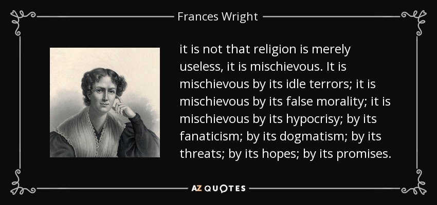 it is not that religion is merely useless, it is mischievous. It is mischievous by its idle terrors; it is mischievous by its false morality; it is mischievous by its hypocrisy; by its fanaticism; by its dogmatism; by its threats; by its hopes; by its promises.