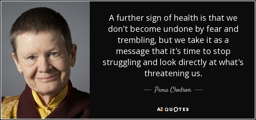 A further sign of health is that we don't become undone by fear and trembling, but we take it as a message that it's time to stop struggling and look directly at what's threatening us.