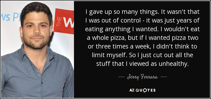 I gave up so many things. It wasn't that I was out of control - it was just years of eating anything I wanted. I wouldn't eat a whole pizza, but if I wanted pizza two or three times a week, I didn't think to limit myself. So I just cut out all the stuff that I viewed as unhealthy.