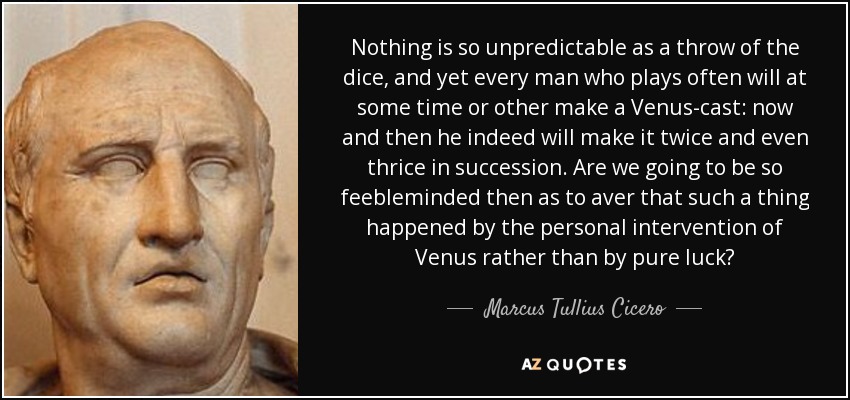 Nothing is so unpredictable as a throw of the dice, and yet every man who plays often will at some time or other make a Venus-cast: now and then he indeed will make it twice and even thrice in succession. Are we going to be so feebleminded then as to aver that such a thing happened by the personal intervention of Venus rather than by pure luck?