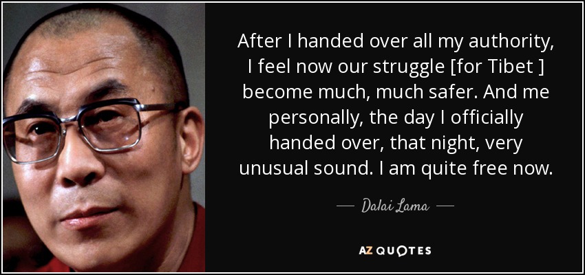 After I handed over all my authority, I feel now our struggle [for Tibet ] become much, much safer. And me personally, the day I officially handed over, that night, very unusual sound. I am quite free now.