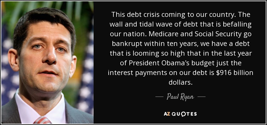 This debt crisis coming to our country. The wall and tidal wave of debt that is befalling our nation. Medicare and Social Security go bankrupt within ten years, we have a debt that is looming so high that in the last year of President Obama's budget just the interest payments on our debt is $916 billion dollars.