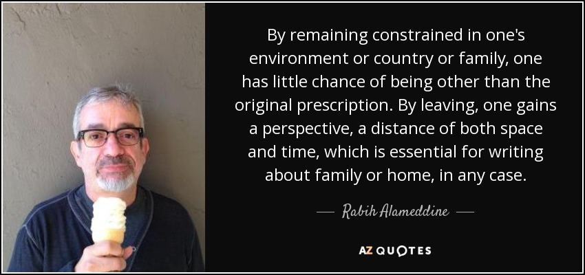 By remaining constrained in one's environment or country or family, one has little chance of being other than the original prescription. By leaving, one gains a perspective, a distance of both space and time, which is essential for writing about family or home, in any case.