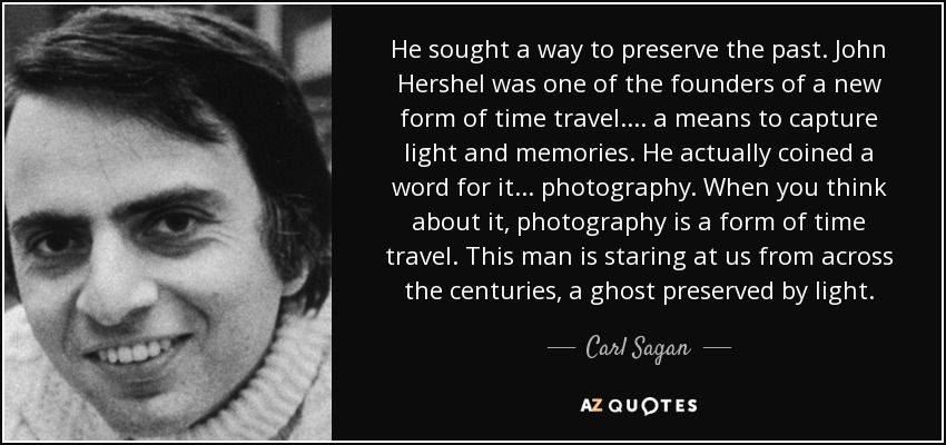 He sought a way to preserve the past. John Hershel was one of the founders of a new form of time travel.... a means to capture light and memories. He actually coined a word for it... photography. When you think about it, photography is a form of time travel. This man is staring at us from across the centuries, a ghost preserved by light.