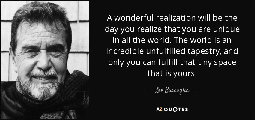A wonderful realization will be the day you realize that you are unique in all the world. The world is an incredible unfulfilled tapestry, and only you can fulfill that tiny space that is yours.