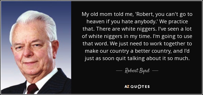 My old mom told me, 'Robert, you can't go to heaven if you hate anybody.' We practice that. There are white niggers. I've seen a lot of white niggers in my time. I'm going to use that word. We just need to work together to make our country a better country, and I'd just as soon quit talking about it so much.