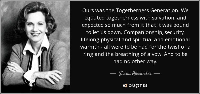 Ours was the Togetherness Generation. We equated togetherness with salvation, and expected so much from it that it was bound to let us down. Companionship, security, lifelong physical and spiritual and emotional warmth - all were to be had for the twist of a ring and the breathing of a vow. And to be had no other way.