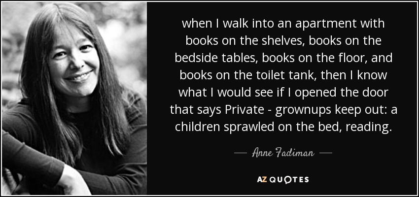 when I walk into an apartment with books on the shelves, books on the bedside tables, books on the floor, and books on the toilet tank, then I know what I would see if I opened the door that says Private - grownups keep out: a children sprawled on the bed, reading.