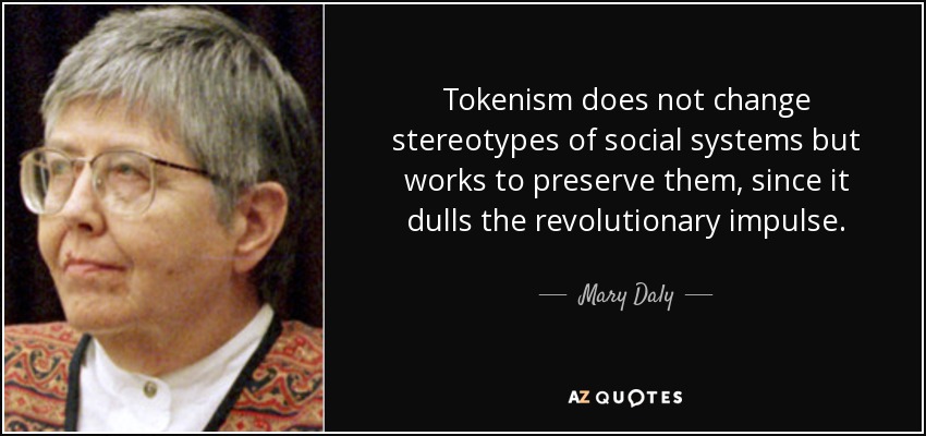 Tokenism does not change stereotypes of social systems but works to preserve them, since it dulls the revolutionary impulse.