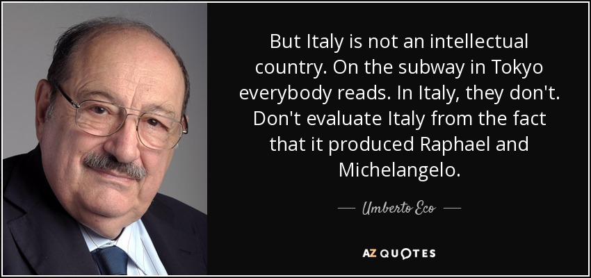 But Italy is not an intellectual country. On the subway in Tokyo everybody reads. In Italy, they don't. Don't evaluate Italy from the fact that it produced Raphael and Michelangelo.