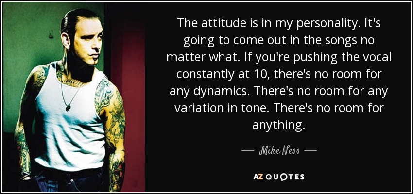The attitude is in my personality. It's going to come out in the songs no matter what. If you're pushing the vocal constantly at 10, there's no room for any dynamics. There's no room for any variation in tone. There's no room for anything.