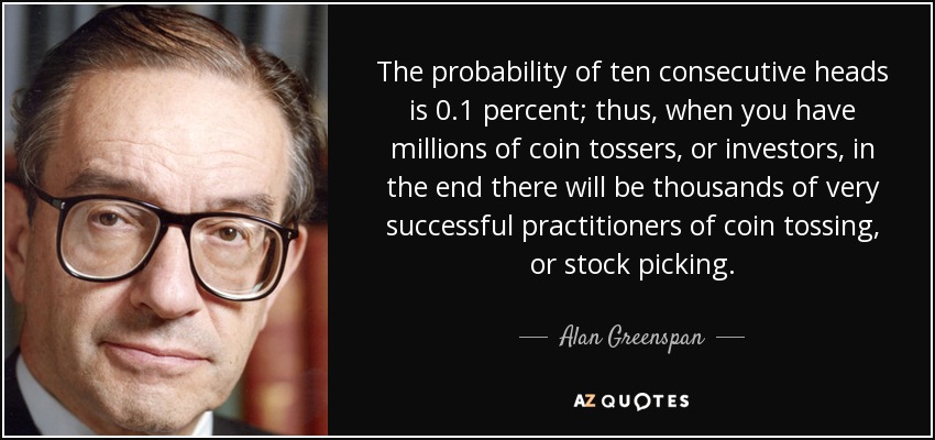 The probability of ten consecutive heads is 0.1 percent; thus, when you have millions of coin tossers, or investors, in the end there will be thousands of very successful practitioners of coin tossing, or stock picking.