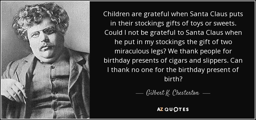Children are grateful when Santa Claus puts in their stockings gifts of toys or sweets. Could I not be grateful to Santa Claus when he put in my stockings the gift of two miraculous legs? We thank people for birthday presents of cigars and slippers. Can I thank no one for the birthday present of birth?