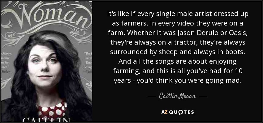 It's like if every single male artist dressed up as farmers. In every video they were on a farm. Whether it was Jason Derulo or Oasis, they're always on a tractor, they're always surrounded by sheep and always in boots. And all the songs are about enjoying farming, and this is all you've had for 10 years - you'd think you were going mad.
