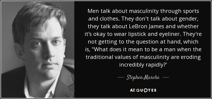 Men talk about masculinity through sports and clothes. They don't talk about gender, they talk about LeBron James and whether it's okay to wear lipstick and eyeliner. They're not getting to the question at hand, which is, "What does it mean to be a man when the traditional values of masculinity are eroding incredibly rapidly?'