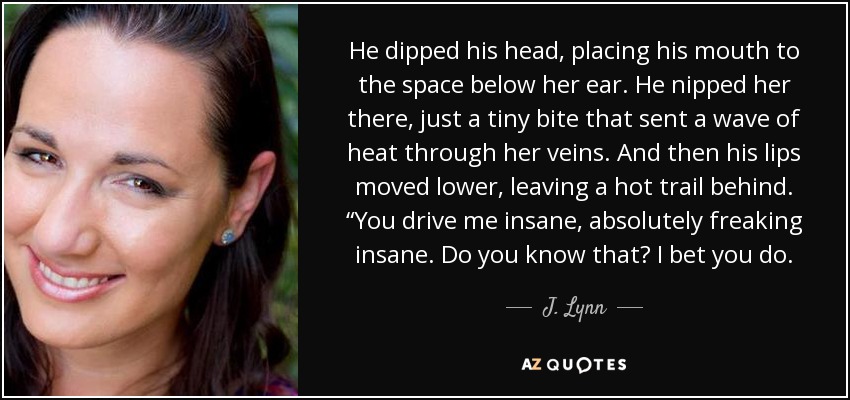 He dipped his head, placing his mouth to the space below her ear. He nipped her there, just a tiny bite that sent a wave of heat through her veins. And then his lips moved lower, leaving a hot trail behind. “You drive me insane, absolutely freaking insane. Do you know that? I bet you do.