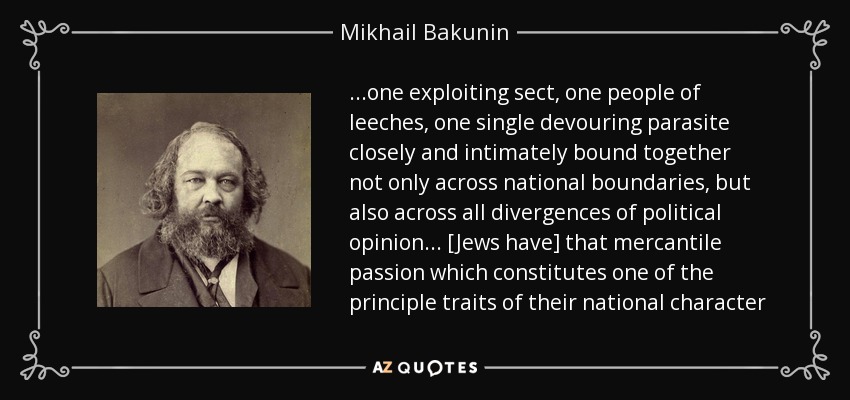 ...one exploiting sect, one people of leeches, one single devouring parasite closely and intimately bound together not only across national boundaries, but also across all divergences of political opinion ... [Jews have] that mercantile passion which constitutes one of the principle traits of their national character