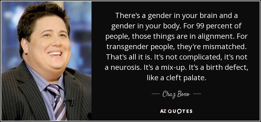 There's a gender in your brain and a gender in your body. For 99 percent of people, those things are in alignment. For transgender people, they're mismatched. That's all it is. It's not complicated, it's not a neurosis. It's a mix-up. It's a birth defect, like a cleft palate.