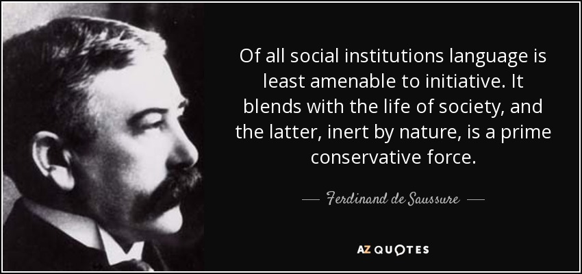 Of all social institutions language is least amenable to initiative. It blends with the life of society, and the latter, inert by nature, is a prime conservative force.