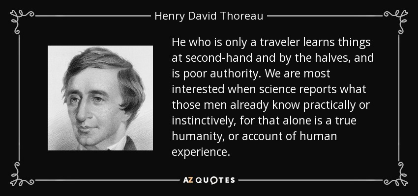 He who is only a traveler learns things at second-hand and by the halves, and is poor authority. We are most interested when science reports what those men already know practically or instinctively, for that alone is a true humanity, or account of human experience.