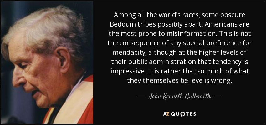 Among all the world's races, some obscure Bedouin tribes possibly apart, Americans are the most prone to misinformation. This is not the consequence of any special preference for mendacity, although at the higher levels of their public administration that tendency is impressive. It is rather that so much of what they themselves believe is wrong.