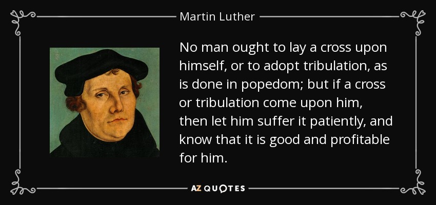 No man ought to lay a cross upon himself, or to adopt tribulation, as is done in popedom; but if a cross or tribulation come upon him, then let him suffer it patiently, and know that it is good and profitable for him.