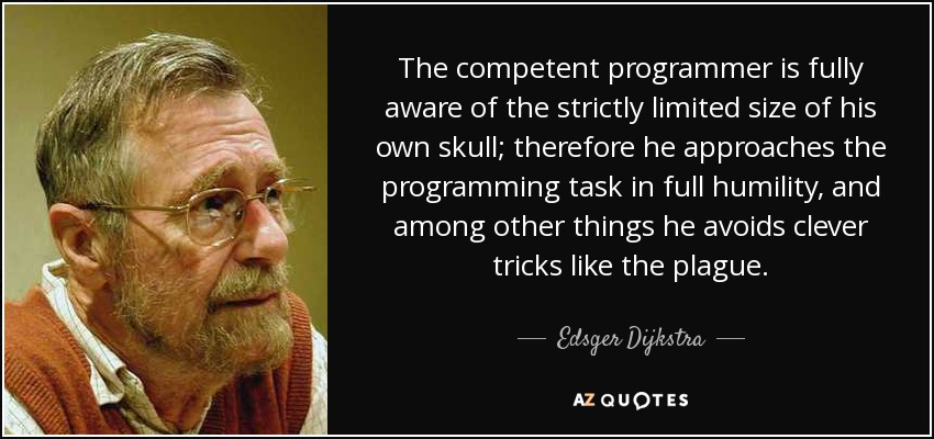 The competent programmer is fully aware of the strictly limited size of his own skull; therefore he approaches the programming task in full humility, and among other things he avoids clever tricks like the plague.