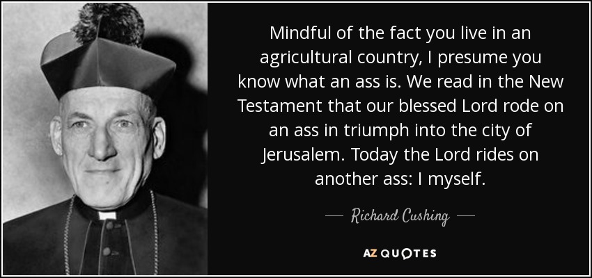 Mindful of the fact you live in an agricultural country, I presume you know what an ass is. We read in the New Testament that our blessed Lord rode on an ass in triumph into the city of Jerusalem. Today the Lord rides on another ass: I myself.