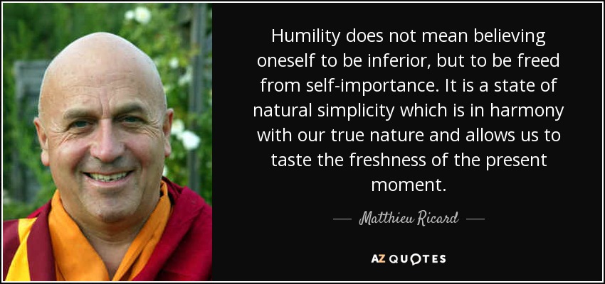 Humility does not mean believing oneself to be inferior, but to be freed from self-importance. It is a state of natural simplicity which is in harmony with our true nature and allows us to taste the freshness of the present moment.