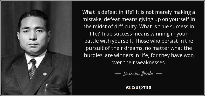 What is defeat in life? It is not merely making a mistake; defeat means giving up on yourself in the midst of difficulty. What is true success in life? True success means winning in your battle with yourself. Those who persist in the pursuit of their dreams, no matter what the hurdles, are winners in life, for they have won over their weaknesses.