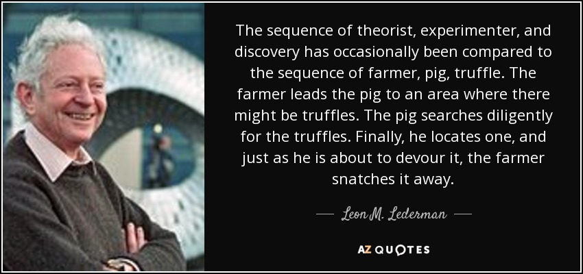 The sequence of theorist, experimenter, and discovery has occasionally been compared to the sequence of farmer, pig, truffle. The farmer leads the pig to an area where there might be truffles. The pig searches diligently for the truffles. Finally, he locates one, and just as he is about to devour it, the farmer snatches it away.