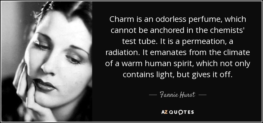 Charm is an odorless perfume, which cannot be anchored in the chemists' test tube. It is a permeation, a radiation. It emanates from the climate of a warm human spirit, which not only contains light, but gives it off.