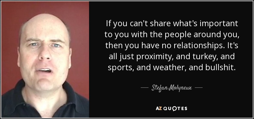 If you can't share what's important to you with the people around you, then you have no relationships. It's all just proximity, and turkey, and sports, and weather, and bullshit.