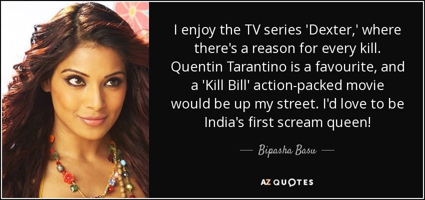 I enjoy the TV series 'Dexter,' where there's a reason for every kill. Quentin Tarantino is a favourite, and a 'Kill Bill' action-packed movie would be up my street. I'd love to be India's first scream queen!