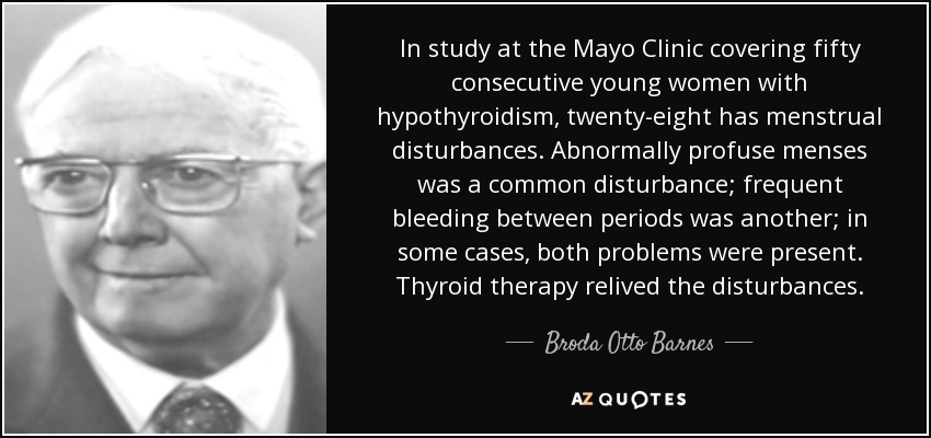In study at the Mayo Clinic covering fifty consecutive young women with hypothyroidism, twenty-eight has menstrual disturbances. Abnormally profuse menses was a common disturbance; frequent bleeding between periods was another; in some cases, both problems were present. Thyroid therapy relived the disturbances.