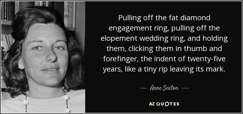 Pulling off the fat diamond engagement ring, pulling off the elopement wedding ring, and holding them, clicking them in thumb and forefinger, the indent of twenty-five years, like a tiny rip leaving its mark.