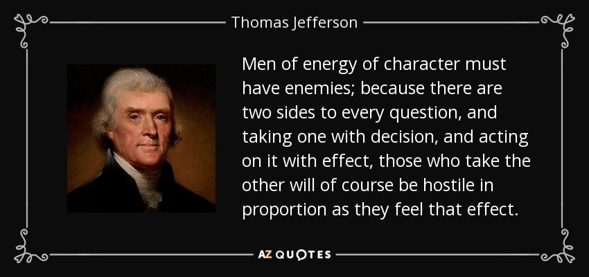 Men of energy of character must have enemies; because there are two sides to every question, and taking one with decision, and acting on it with effect, those who take the other will of course be hostile in proportion as they feel that effect.
