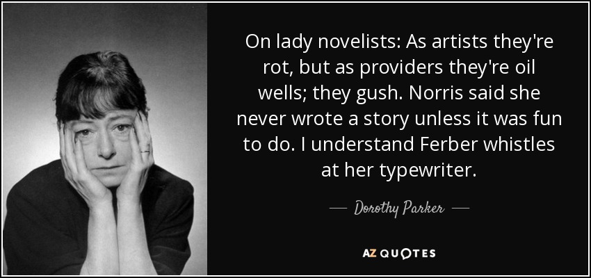 On lady novelists: As artists they're rot, but as providers they're oil wells; they gush. Norris said she never wrote a story unless it was fun to do. I understand Ferber whistles at her typewriter.