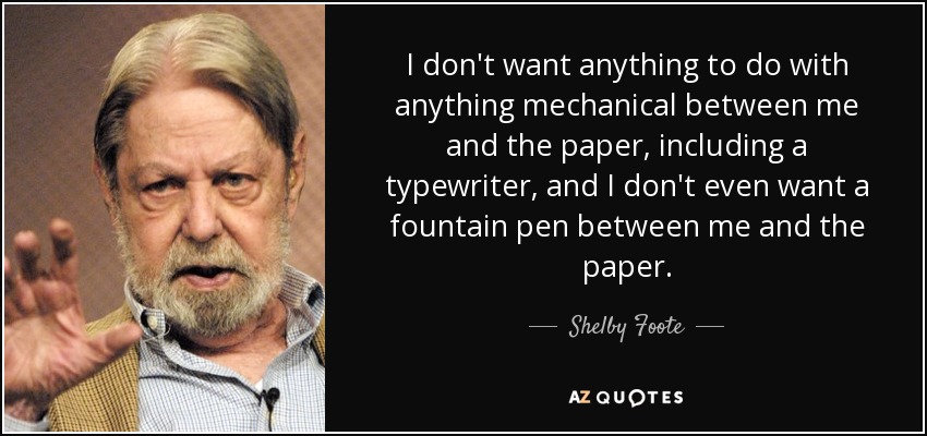 I don't want anything to do with anything mechanical between me and the paper, including a typewriter, and I don't even want a fountain pen between me and the paper.