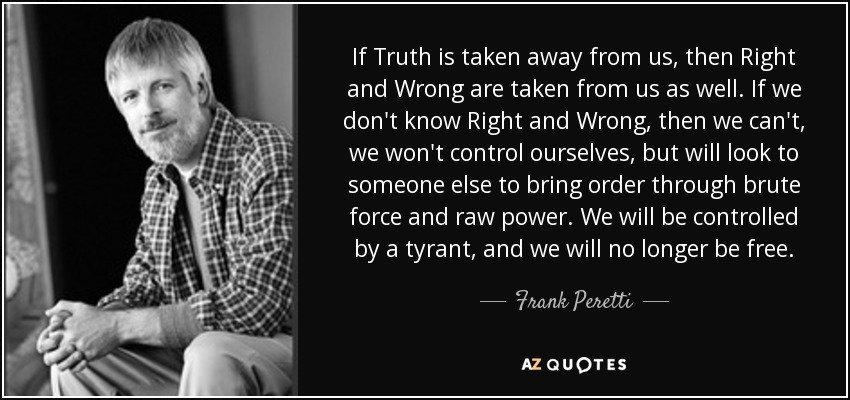 If Truth is taken away from us, then Right and Wrong are taken from us as well. If we don't know Right and Wrong, then we can't, we won't control ourselves, but will look to someone else to bring order through brute force and raw power. We will be controlled by a tyrant, and we will no longer be free.