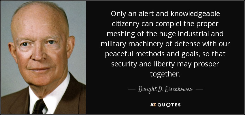 Only an alert and knowledgeable citizenry can complel the proper meshing of the huge industrial and military machinery of defense with our peaceful methods and goals, so that security and liberty may prosper together.