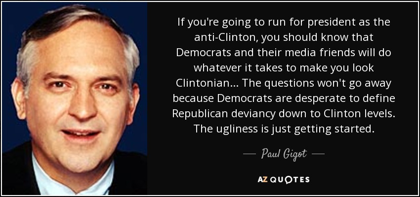 If you're going to run for president as the anti-Clinton, you should know that Democrats and their media friends will do whatever it takes to make you look Clintonian... The questions won't go away because Democrats are desperate to define Republican deviancy down to Clinton levels. The ugliness is just getting started.
