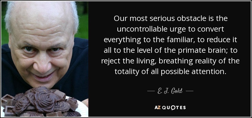 Our most serious obstacle is the uncontrollable urge to convert everything to the familiar, to reduce it all to the level of the primate brain; to reject the living, breathing reality of the totality of all possible attention.