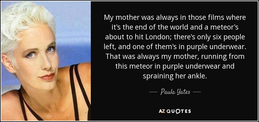 My mother was always in those films where it's the end of the world and a meteor's about to hit London; there's only six people left, and one of them's in purple underwear. That was always my mother, running from this meteor in purple underwear and spraining her ankle.