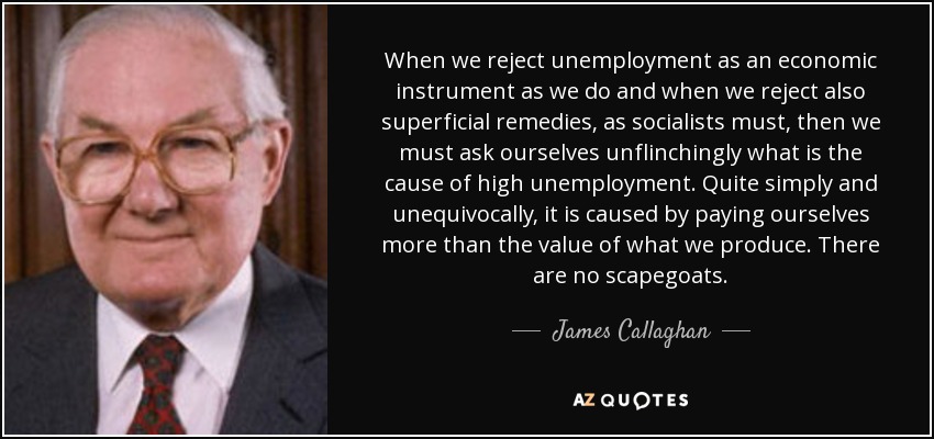When we reject unemployment as an economic instrument as we do and when we reject also superficial remedies, as socialists must, then we must ask ourselves unflinchingly what is the cause of high unemployment. Quite simply and unequivocally, it is caused by paying ourselves more than the value of what we produce. There are no scapegoats.
