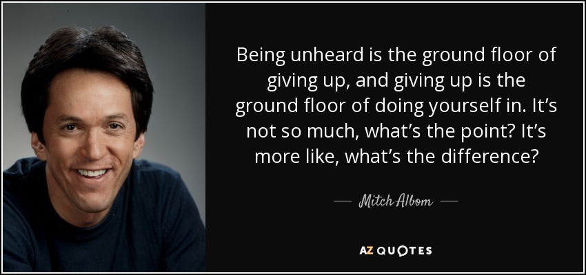 Being unheard is the ground floor of giving up, and giving up is the ground floor of doing yourself in. It’s not so much, what’s the point? It’s more like, what’s the difference?