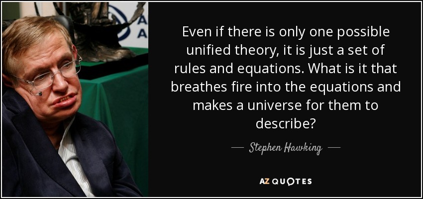 Even if there is only one possible unified theory, it is just a set of rules and equations. What is it that breathes fire into the equations and makes a universe for them to describe?