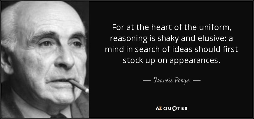 For at the heart of the uniform, reasoning is shaky and elusive: a mind in search of ideas should first stock up on appearances.