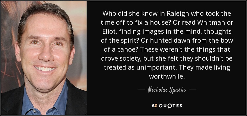 Who did she know in Raleigh who took the time off to fix a house? Or read Whitman or Eliot, finding images in the mind, thoughts of the spirit? Or hunted dawn from the bow of a canoe? These weren't the things that drove society, but she felt they shouldn't be treated as unimportant. They made living worthwhile.