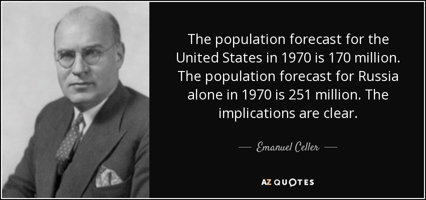 The population forecast for the United States in 1970 is 170 million. The population forecast for Russia alone in 1970 is 251 million. The implications are clear.